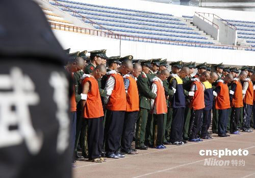 9月18日中午11時(shí),新疆伊犁州公、檢、法等部門在伊寧市體育場舉行公捕公判大會(huì)。公判大會(huì)上,新疆自治區(qū)高級人民法院伊犁州分院對買買提艾力.阿不都熱合曼等12名犯罪分子進(jìn)行公開宣判,對艾力.庫那洪等12名危害國家安全及嚴(yán)重?cái)_亂社會(huì)秩序的犯罪嫌疑人公開執(zhí)行逮捕。中新社發(fā) 李志剛 攝