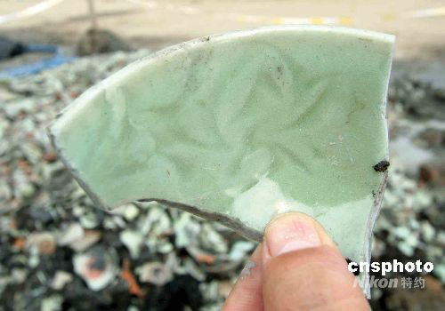 9月下旬,記者來(lái)到河下古鎮(zhèn)城河水道開挖工地現(xiàn)場(chǎng),看到大量同種青瓷碎片裸露在距地表3米多深的河底,有一些已被挖掘機(jī)抓到地面臨時(shí)隔離起來(lái)。區(qū)有關(guān)部門已著手制訂考古方案,并對(duì)發(fā)掘現(xiàn)場(chǎng)落實(shí)了有效的保護(hù)措施。中新社發(fā) 李正林 攝