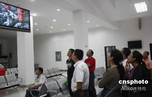 9月25日晚,“神七”升空引起國人關(guān)注,圖為在江蘇南通興東機場候機的乘客觀看“神七”升空的電視直播。中新社發(fā) 盛佳鵬 攝