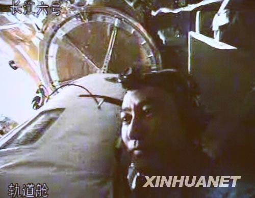9月27日,航天員翟志剛在神舟七號(hào)載人飛船軌道艙確認(rèn)艙門檢漏情況(攝于北京航天飛行控制中心大屏幕)。當(dāng)日中午,航天員出艙活動(dòng)任務(wù)開(kāi)始。新華社記者陳建力攝