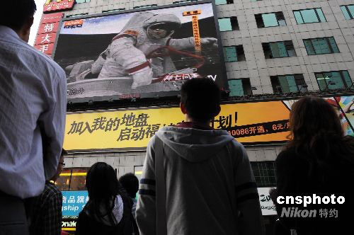 9月27日下午,北京王府井大街,正在直播神七航天員出艙活動的大屏幕吸引眾人目光,駐足觀看民眾不時為航天員圓滿完成任務(wù)歡呼。中新社發(fā) 廖攀 攝