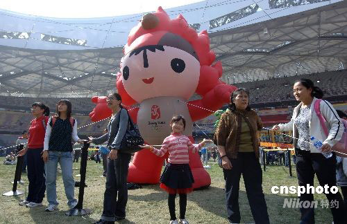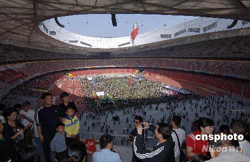 9月30日,“十一”國慶長假第二天,旅游黃金周進(jìn)入高潮,到北京旅游的各地游客都渴望進(jìn)入北京奧運(yùn)會(huì)主體育場(chǎng)“鳥巢”,有幸購到參觀票的游客在鳥巢盡情玩耍拍照。 中新社發(fā) 鄒憲 攝