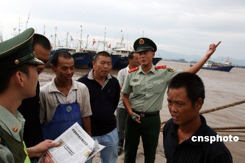 9月30日,邊防官兵在溫州飛云江漁港向待臺(tái)風(fēng)“薔薇”警報(bào)解除后出海的漁民通報(bào)外輪“HELIOS 3”號(hào)船在溫州南麂海域沉沒(méi)情況,提醒漁船在出海后注意發(fā)現(xiàn)遇險(xiǎn)人員及漂浮物。 9月29日下午2時(shí)許,在巴拿馬注冊(cè)的韓國(guó)貨輪“HELIOS 3”號(hào)船從緬甸載6000噸原木前往浙江嘉興港,在航經(jīng)溫州南麂島以南約5海里處時(shí),受臺(tái)風(fēng)“薔薇”影響,船上貨物移位,造成兩艙進(jìn)水發(fā)生險(xiǎn)情后沉沒(méi),船上共有韓國(guó)、緬甸、印尼等國(guó)家地區(qū)的外籍船員15名。海上搜救部門(mén)立即啟動(dòng)應(yīng)急預(yù)案,當(dāng)晚有2名外籍船員在救生筏上被一艘路過(guò)的船舶救起,其余13名遇險(xiǎn)外籍船員仍在搜尋之中。中新社發(fā) 蔡寬元 攝
