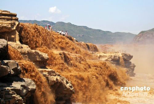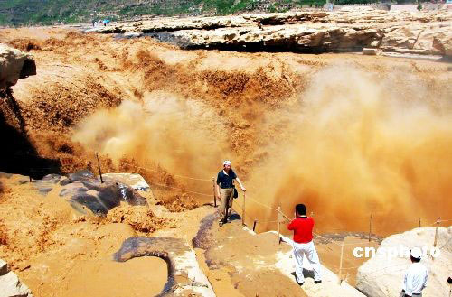 2008年10月1日,游人在黃河壺口處游覽,拍照留念。位于陜西宜川縣和山西吉縣交界處的黃河壺口瀑布,有“天下黃河一壺收”之譽(yù),主瀑布寬約40米左右,落差40米以上,今年上游來水量增加,壺口瀑布流量隨之增加,“十一”黃金周吸引了眾多游客。中新社發(fā) 沙漠 攝