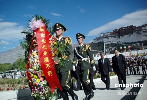 10月1日上午,在布達(dá)拉宮廣場(chǎng)上舉行升國(guó)旗儀式后,在紀(jì)念碑前向革命先烈敬獻(xiàn)了花籃,緬懷為西藏革命和建設(shè)事業(yè)作出重大貢獻(xiàn)的革命前輩們。圖為武警戰(zhàn)士抬著花籃走向布達(dá)拉宮廣場(chǎng)上的紀(jì)念碑。中新社發(fā) 周波 攝