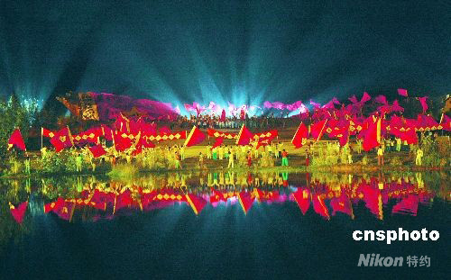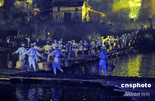 十月六日晚八時(shí),江西省首個(gè)大型戶外實(shí)景演出《井岡山》,再現(xiàn)當(dāng)年八十年前紅軍挑糧上井岡山情景。這場(chǎng)《井岡山》的演出由近千名當(dāng)?shù)剞r(nóng)民參演,采用一千多盞燈光、五萬(wàn)五千多平方米的舞臺(tái)。中新社發(fā) 段長(zhǎng)征 攝