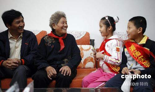 10月7日重陽(yáng)節(jié),無(wú)錫市清揚(yáng)實(shí)驗(yàn)小學(xué)為提高少先隊(duì)員尊老、敬老、愛(ài)老意識(shí),進(jìn)一步營(yíng)造全社會(huì)尊老愛(ài)老氛圍,結(jié)合“喜看家鄉(xiāng)改革開(kāi)放30年巨變”,開(kāi)展“和諧小使者訪名人”活動(dòng)。在世界上第一個(gè)從北坡登上珠峰的女英雄——潘多的家中,無(wú)錫市清揚(yáng)實(shí)驗(yàn)小學(xué)的少先隊(duì)員們與潘多奶奶面對(duì)面地交流著。潘多奶奶勉勵(lì)少先隊(duì)員要在學(xué)習(xí)上要發(fā)揚(yáng)“攀登”精神,克服困難,勇攀學(xué)習(xí)高峰。 中新社發(fā) 張浩 攝