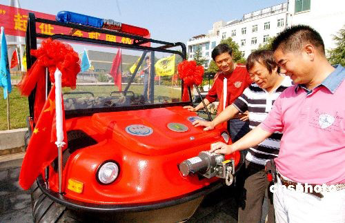 10月9日上午,一輛水陸兩棲全地型功能車交付中國南極科考隊(duì),并將于10月20日搭乘“雪龍?zhí)枴?投入笫25次南極科學(xué)考察。這次奔赴南極笫25次科考的水陸兩棲全地型功能車,專門針對(duì)南極復(fù)雜的地形和氣候,對(duì)車體、輪胎、散熱系統(tǒng)、變速檔位都進(jìn)行改進(jìn),裝上防冰刀扎的防爆輪胎,并增配了自動(dòng)牽引鉤、牽引鋼絲繩、水上推進(jìn)的螺旋槳及警示燈。中新社發(fā) 張建成 攝