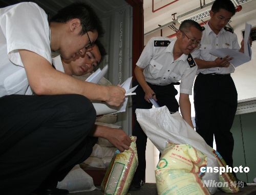 10月9日,參展第五屆中國(guó)—東盟博覽會(huì)的首批貨物順利抵達(dá)南寧。該批貨物為來(lái)自柬埔寨的大米、酒和木制家具等,廣西出入境檢驗(yàn)檢疫局和南寧海關(guān)在確保對(duì)疫病疫情有效監(jiān)管的前提下,實(shí)行“聯(lián)合辦公、共同查驗(yàn)、一站式服務(wù)”的工作機(jī)制,迅速為展品辦理通關(guān)手續(xù)。中新社發(fā) 林艷華 攝