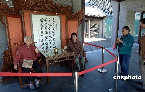 10月10日,免費進入北京奧林匹克公園及老舍茶館“瓦院”參觀的游客,反客為主,在這座北京三進制四合院中,東坐坐、西坐坐,并在正堂上就座拍照留影,感受老北京文化。中新社發(fā) 鄒憲 攝