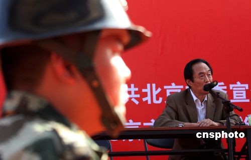 2008年10月11日,第八屆北京圖書節(jié)在地壇公園舉行,百家講壇學者閻崇年專門來到地壇圖書節(jié)與廣大讀者交流清史。由于閻崇年無錫簽售遭遇“耳光”事件,為防止此類事件再次發(fā)生,主辦方請來多名頭戴鋼盔的保安在現場維持秩序。中新社發(fā) 吳芒子 攝