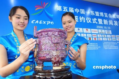10月13日,由河南禹州孔家鈞窯燒制的2008中國(guó)—東盟博覽會(huì)鈞瓷國(guó)禮《象天鼎》運(yùn)抵廣西南寧,作品由中國(guó)工藝美術(shù)大師孔相卿設(shè)計(jì),以中國(guó)古老的青銅禮器“鼎”為基本造型設(shè)計(jì)制作,表達(dá)了中國(guó)與東盟國(guó)家互利合作、共享繁榮的美好愿望。據(jù)悉,第五屆中國(guó)—東盟博覽會(huì)將于10月22日—25日在中國(guó)廣西南寧舉行,《象天鼎》將作為國(guó)禮,贈(zèng)送給參加博覽會(huì)的各國(guó)政要。中新社發(fā) 牛書培 攝