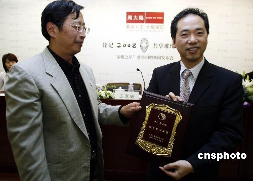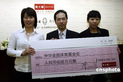 10月15日,著名珠寶品牌周大福在國家體育總局,舉行名為“銘記2008,共享璀璨榮耀”的慈善捐贈新聞發(fā)布會,宣布將周大福Forevermark永恒印記“榮耀之星”的部分拍賣款項50萬元人民幣,捐助予“中華全國體育基金會(中國運(yùn)動員委員會)”,這也是該委員會成立以來的首筆社會愛心團(tuán)體的公益捐贈,此筆善款將用于支持該委員會開展體育公益工作,以號召更多企業(yè)關(guān)注和支持中國體育事業(yè)發(fā)展。周大福董事陳世昌先生、國家體育總局體育基金管理中心副主任、中華全國體育基金會副理事長王彥敏先生與著名運(yùn)動員周繼紅女士(國家體育總局游泳運(yùn)動管理中心副主任、運(yùn)動員委員會主任委員),錢紅女士(游壇“五朵金花”之一),高紅(“鏗鏘玫瑰”之一、老國家女足守門員)均蒞臨現(xiàn)場。此前拍賣的Forevermark永恒印記“榮耀之星”27.16克拉梨形美鉆,作為周大福專為2008年北京奧運(yùn)會獻(xiàn)禮之作,脫胎于重達(dá)70克拉的南非原產(chǎn)鉆胚。更為珍貴之處在于在其臺面上印記有源自周大福鉆石原胚全球合作伙伴——世界最大的鉆石原胚供應(yīng)商戴比爾斯集團(tuán)的“Forever mark”永恒印記”,其中特別珍選并全球唯一的“20080808”序列號碼,特別銘記2008北京奧運(yùn),銘記中華體育世紀(jì)盛事。中新社發(fā) 楊可佳 攝