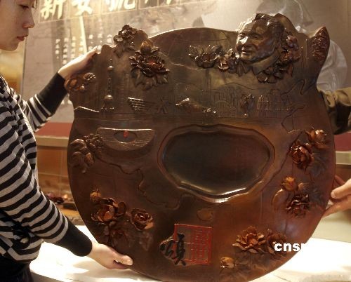 10月15日,一方取名為“盛世頌”的巨型澄泥硯臺(tái)在河南洛陽(yáng)制作完畢亮相。據(jù)悉,這是為紀(jì)念中國(guó)改革開(kāi)放30年,中國(guó)工藝大師李中獻(xiàn)及其弟子李湛歷時(shí)近一年傾心制作的。中新社發(fā) 張曉理 攝