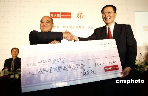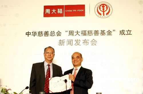 10月中旬,周大福集團(tuán)與中華慈善總會(huì)在京召開新聞發(fā)布會(huì),宣布 “周大福慈善基金” 正式成立。發(fā)布會(huì)上,全國政協(xié)常委、中華慈善總會(huì)榮譽(yù)會(huì)長、周大福集團(tuán)董事總經(jīng)理鄭家純博士代表周大福集團(tuán),向中華慈善總會(huì)轉(zhuǎn)交了“基金”首筆慈善捐款150萬元,用以啟動(dòng)開展“基金”第一階段助學(xué)助孤慈善項(xiàng)目。全國人大代表、中華慈善總會(huì)副會(huì)長李本公,中華慈善總會(huì)副會(huì)長張道誠,中華慈善總會(huì)秘書長劉國林,副秘書長韓京津出席了儀式,并向鄭家純博士頒發(fā)了捐贈(zèng)證書和榮譽(yù)會(huì)長證書。中新社發(fā) 楊可佳 攝