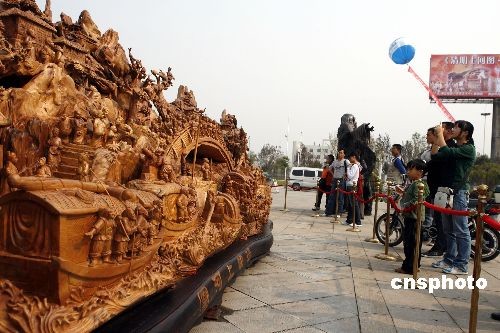 10月18日,開封展出巨型根雕《清明上河圖》。在26屆開封菊花會(huì)期間,舉辦了中國觀賞石、玉器、古玩、字畫、花卉、盆景、根雕交易會(huì),一些平日里難得一見的珍品,紛紛亮相。來自北京的巨型香樟木根雕《清明上河圖》,材料采用東南亞熱帶香樟木,樹齡2300年。作品長18米,已經(jīng)申報(bào)吉尼斯世界紀(jì)錄。中新社發(fā) 慎重 攝