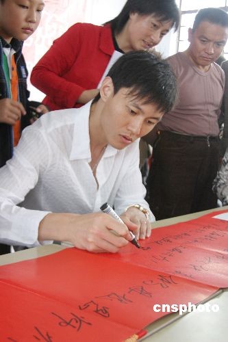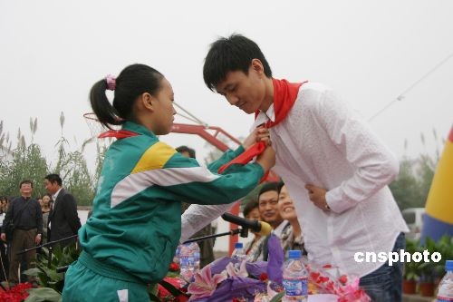 2008年10月19日,北京奧運(yùn)佩劍冠軍仲滿回到家鄉(xiāng)母校江蘇海安縣大公鎮(zhèn)北凌小學(xué)和北凌初中,回顧自己獲得冠軍的歷程,并為師生簽名、合影,感謝母校對他的培育。中新社發(fā) 江蘇-徐瑞平 攝