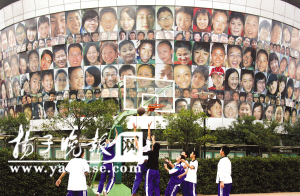 20日,南京金陵中學(xué)河西分校近400平方米的“笑臉墻”正式亮相,從校園征集的272個(gè)孩子的笑臉圖被貼在學(xué)校餐廳三層圓弧形的玻璃幕墻上,成為江蘇中小學(xué)校園最大的一面“笑臉墻”。 記者 張琳/文 宋嶠/攝
