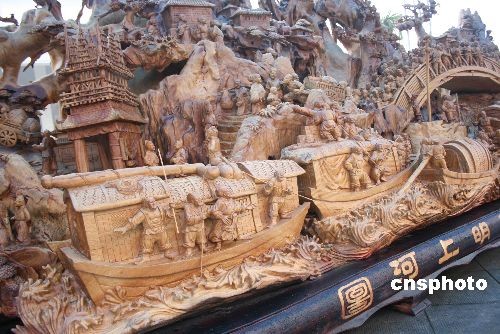 10月21日,長18米的巨型根雕《清明上河圖》在開封東京藝術(shù)中心廣場展出。據(jù)工作人員介紹,這一作品原木是一株生長在東南亞熱帶崇山峻嶺中的香樟古木,樹齡在2300年以上,樹高百米,樹干直徑4米,根徑20米,完全暴露風(fēng)干近10年。后以北宋畫家張擇端的《清明上河圖》為藍(lán)本,由福建35位藝術(shù)家和工匠歷時(shí)5年精雕細(xì)刻而成。雕刻完成后,作品長18米,高2.56米,寬2米,重12噸。 據(jù)悉,這一來自福建莆田的巨型香樟木根雕《清明上河圖》作品,已經(jīng)申報(bào)吉尼斯世界紀(jì)錄。中新社發(fā) 劉書亭 攝