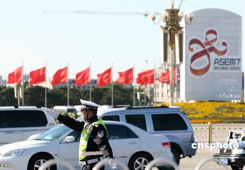 2008年10月23日,交警在北京天安門廣場(chǎng)為第七屆亞歐首腦會(huì)議代表抵京執(zhí)勤。據(jù)悉,24日至25日,第七屆亞歐首腦會(huì)議在北京舉行。為確保亞歐首腦會(huì)議順利進(jìn)行,保證交通安全暢通,北京市公安局近日發(fā)布通告,會(huì)議期間,將對(duì)部分地區(qū)及道路分時(shí)、分段采取臨時(shí)交通管制措施。中新社發(fā) 魯谷 攝