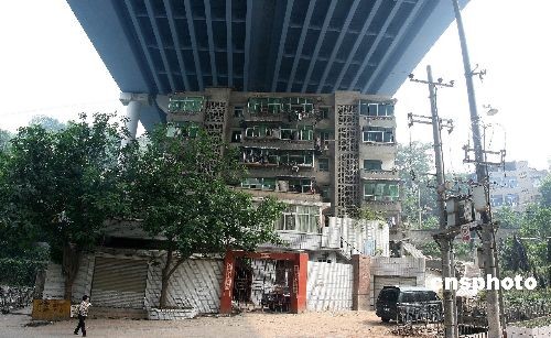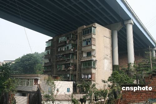 圖為重慶渝黔高速路南山立交橋下的一幢6層居民樓,此樓樓頂立交橋,背倚橋柱,在網(wǎng)上被稱為“終年曬不到太陽(yáng)、淋不到雨的最牛的樓房”。而近日這棟“最牛樓房”還未拆遷,旁邊卻又要開(kāi)建新房,引起了廣大市民的熱議。中新社發(fā) 孫須 攝