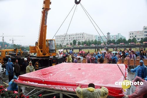 10月26日下午,四川省南溪縣豆腐干食品文化節(jié)現(xiàn)場(chǎng),一塊長(zhǎng)4.21米、寬4.2米、高9.5厘米左右,重達(dá)1.8噸左右的巨型豆腐干特別引人注目,它將于26日晚間揭開紅蓋頭,申報(bào)世界吉尼斯紀(jì)錄。 南溪豆腐干制作工藝因技術(shù)獨(dú)特、工藝的傳承人缺乏等原因,已被列入四川省首批非物質(zhì)文化遺產(chǎn)目錄。這次試制的巨型豆腐干全部按照豆腐干傳統(tǒng)工藝制作。數(shù)十名技術(shù)骨干和工人經(jīng)30多個(gè)小時(shí)的辛勤勞作,共使用了黃豆1300余公斤。中新社發(fā) 陳涌 攝