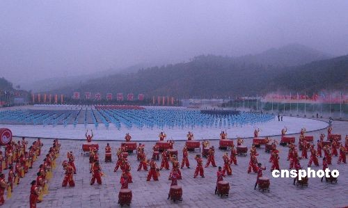 十月三十日,第三屆世界傳統(tǒng)武術節(jié)舉行“走進武當”系列活動,武當山舉行萬人太極拳表演,來自全球六十九個國家和地區(qū)的一百六十五支代表隊、兩千多名武術愛好者共赴這一“武林盛會”。圖為萬人表演之前的歡迎鑼鼓。中新社發(fā) 艾啟平 攝