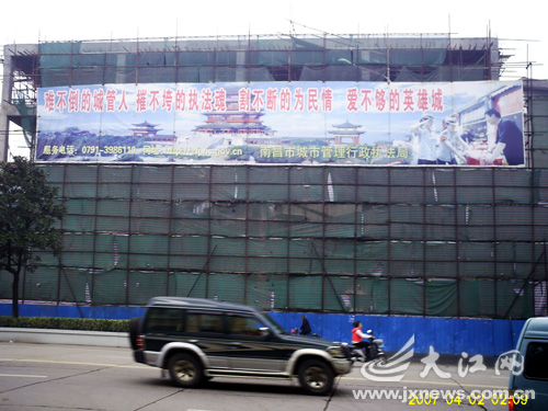 對此,南昌市行政執(zhí)法局直屬二大隊辦公室主任黃躍說,宣傳語是南昌市行政執(zhí)法局東湖分局懸掛的。該大樓報批時只說改造,如今,打著改造的名義重新搭建,屬于違章建筑。記者鄒曉華 實習生李芳