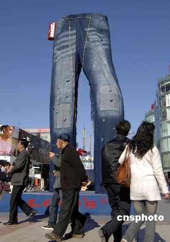 10月31日,北京王府井金街上的某商家樹起巨型牛仔褲招牌造型,吸引路人目光。在全球金融危機大背景下,眾多商家不得不利用各種新奇手法賺人眼球。中新社發(fā) 徐曦弋 攝