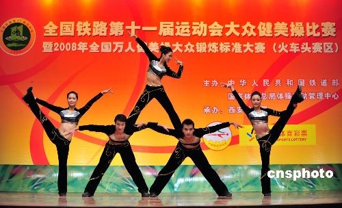 11月2日,全國(guó)鐵路第十一屆運(yùn)動(dòng)會(huì)大眾健美操賽在西安開賽,17支代表隊(duì)的173名選手參加了職工大眾組和中年組7個(gè)級(jí)別的比賽。圖為參賽選手在大眾健美操比賽中。中新社發(fā) 唐振江 攝