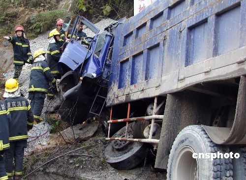 11月3日上午8時(shí)許,重慶市巴南區(qū)境內(nèi),一輛車牌為渝BC3216東風(fēng)大卡車下坡時(shí)因路滑剎車失靈撞倒在山坡上,司機(jī)被困,經(jīng)過消防官兵1個(gè)小時(shí)緊張救援,成功將其救出。圖為消防人員緊張施救。中新社發(fā) 張東清 攝