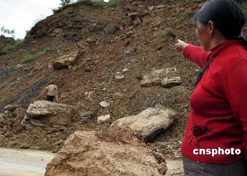 圖為3日記者在趕往災(zāi)區(qū)途中,行至云南南澗縣至景東縣的公路邊,當(dāng)?shù)匾晃淮迕裰v述2日泥石流發(fā)生時(shí)的景象。