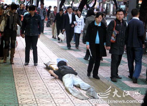 3日下午5時許,一個20出頭“高位截肢”的小伙艱難爬行在南昌市中山路人行道上,向路人訴說不幸遭遇:“一場車禍奪走了父母的生命,我也因這場車禍高位截肢。”一些好心市民見狀,紛紛慷慨解囊。傍晚6時30分許,“截肢”小伙爬進了一條小巷內(nèi),另一男子提來了一大包衣服。這時,“截肢”小伙突然站了起來,換上一套時尚的休閑裝?吹接浾吲恼,兩人迅速消失。(文/圖劉虎記者歐陽蘇敏)