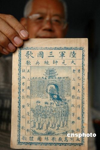2008年11月4日,一本塵封80年民國年間出版的張作霖《大元帥練兵歌》在山東濱州無棣面世。該書1928年由天津河?xùn)|特制、聚文山房發(fā)行!洞笤獛浘毐琛烦氖敲駠埠,夸的是本軍統(tǒng)帥,說的是當(dāng)兵意義,真實(shí)記錄了奉軍出操、練兵、行軍、打仗的場景。令人驚奇的是,被毛澤東反復(fù)推薦的紅軍歌曲《三大紀(jì)律八項(xiàng)注意》的曲調(diào),竟是張作霖的《大元帥練兵歌》。中新社發(fā) 梁寶海 攝