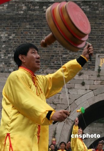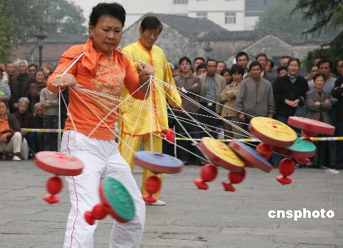 11月6日,在南京中華門城堡廣場(chǎng)舉行的2008中國(guó)南京第二屆民間藝術(shù)節(jié)廣場(chǎng)活動(dòng)上,由南京市空竹協(xié)會(huì)數(shù)十位空竹愛好者展示的空竹絕技,吸引了眾多市民和游客。中新社發(fā) 鐘山 攝