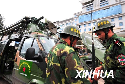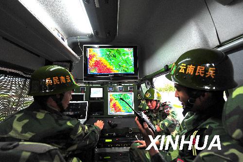 在云南楚雄等地發(fā)生滑坡泥石流災害后,云南民兵預備役應急通信分隊派出安裝著地理信息、GPS定位、衛(wèi)星圖像傳輸、微波無線通信等車載工作系統(tǒng)組合的移動指揮車及數(shù)輛前方信息偵察車,用科技手段為救災工作提供精確信息和清晰圖像。新華社記者 陳海寧 攝