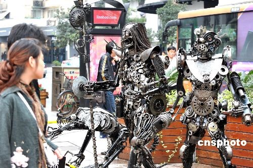 11月8日,由裝置藝術(shù)家周峰先生創(chuàng)作的九件“汽車零件機(jī)器人”在浙江杭州西湖創(chuàng)意市集上首次集中展示,嶄新的藝術(shù)創(chuàng)作形式吸引了眾多的眼球。據(jù)了解,近年來,作者大量收集汽車、摩托車上的廢舊金屬零件進(jìn)行焊接組合,創(chuàng)作了無敵戰(zhàn)士、恐龍、眼鏡蛇等一批風(fēng)格獨特的“機(jī)器人”。中新社發(fā) 李忠1 攝