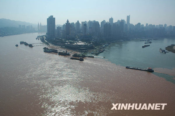 11月8日,受長(zhǎng)江上游持續(xù)降雨和三峽工程實(shí)驗(yàn)性高位蓄水影響,重慶朝天門港的嘉陵江、長(zhǎng)江交匯處江水呈現(xiàn)一清一渾,涇渭分明。據(jù)了解,往年入冬時(shí)節(jié)長(zhǎng)江、嘉陵江已進(jìn)入枯水期,今年隨著三峽水庫(kù)蓄水,長(zhǎng)江水位迅速上升,當(dāng)日18時(shí),重慶寸灘長(zhǎng)江水位達(dá)到175.32米。 新華社發(fā)(周會(huì) 攝)