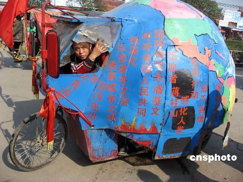 11月10日,一個地球模樣的三輪車來到安徽省亳州市宣傳環(huán)保,吸引市民駐足觀看。38歲的江西小伙蔣桂山自去年6月5日從江西九江開始,騎著自制的直徑一米的地球儀三輪房車宣傳環(huán)保,先后途經上海、天津等140個城市。之后,他來到安徽亳州講“環(huán)!薄JY桂山預計用4年時間蹬著“地球車”走遍全國400多個城市,向人們宣傳節(jié)約用水、用電和能源,他想用這種特殊的方式引起人們關注環(huán)保。中新社發(fā) 張延林 攝
