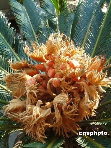 11月10日,江蘇海安縣糧食局退休干部孫道峰擺放在門口有30余年的一棵鐵樹(shù)開(kāi)花,花心長(zhǎng)出橘紅色的果實(shí)。據(jù)了解,一般鐵樹(shù)要有60至70年的樹(shù)齡才開(kāi)花,鐵樹(shù)結(jié)果更為少見(jiàn)。中新社發(fā) 徐瑞平 攝