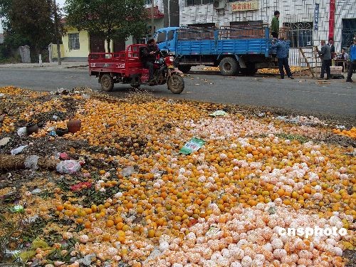 2008年11月10日,湖北宜昌市夷陵區(qū)鴉鵲嶺鎮(zhèn),被當(dāng)成垃圾傾倒在路邊的柑橘隨處可見(jiàn)。據(jù)悉,受四川廣元“蛆柑”事件影響,沒(méi)有出現(xiàn)疫情的湖北省柑橘外銷(xiāo)曾一度全面停滯,經(jīng)有關(guān)有關(guān)部門(mén)“救市”后,目前銷(xiāo)售量已恢復(fù)到正常水平的85%,但柑橘收購(gòu)價(jià)較往年暴跌,而且收購(gòu)商對(duì)柑橘的大小、品相等要求嚴(yán)格,導(dǎo)致大量“等外品”柑橘被當(dāng)成垃圾倒掉,經(jīng)濟(jì)損失慘重,成為橘農(nóng)們的錐心之痛。中新社發(fā) 劉君鳳 攝