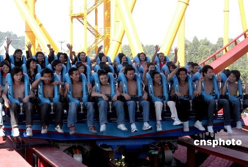 11月11日所謂“光棍節(jié)”,對于單身人士來說是一個特別的節(jié)日,廣州長隆歡樂世界為“男女光棍”舉辦別開生面的單身派對活動——“脫光勇士”挑戰(zhàn)愛情過山車!懊摴狻庇袃蓪雍x,一是把上衣脫光挑戰(zhàn)愛情過山車;二是找到心中的伴侶,脫離光棍生涯。中新社發(fā) 劉衛(wèi)勇 攝