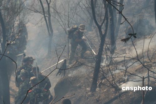 11月13日下午,武警官兵在廣東省珠海市板樟山南側(cè)山林撲救山火。當(dāng)日14時(shí)25分,珠海市板樟山南側(cè)山林突發(fā)山火,火勢(shì)兇猛,迅速向市內(nèi)居民區(qū)蔓延。接到火情命令后,武警廣東總隊(duì)珠海市支隊(duì)緊急出動(dòng)100名官兵,火速趕往現(xiàn)場(chǎng),奮戰(zhàn)三小時(shí)成功將山火撲滅,搶救山林12畝。 中新社發(fā) 陸建東 攝