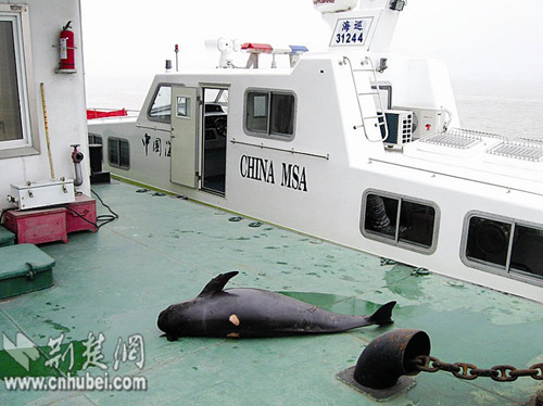 昨日中午,武漢海事局執(zhí)法人員在長(zhǎng)江龍口水道巡航時(shí),發(fā)現(xiàn)一具江豚的尸體。嘉魚縣漁政局技術(shù)人員趕來(lái),經(jīng)鑒定,該江豚體長(zhǎng)1.45米,重約60公斤,身上有明顯的捕魚器具傷痕,是致其死亡的直接原因。