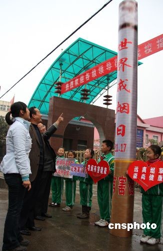 11月17日,小學(xué)生制作的巨無霸“香煙”引來過往市民好奇的目光。當(dāng)日是“世界戒煙日”,山東棗莊市回民小學(xué)學(xué)生用舊報(bào)紙和卡紙等制作了一支3.6米高的巨無霸“香煙”模型,豎立在學(xué)校大門旁,并組成戒煙小分隊(duì),勸告煙民戒煙。中新社發(fā) 吉 喆 攝