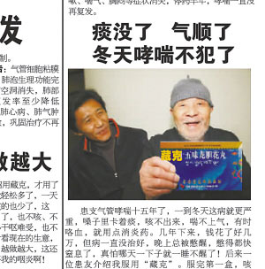 “患友介紹我服用了‘藏克’。服完第一盒,咳嗽、胸悶就緩解多了。”昨天(22日),看著我市(重慶市)某報(bào)上的一則藥品廣告,90歲高齡的老人張治欽感到納悶,“我從來(lái)沒(méi)得過(guò)這病,卻上了該藥的宣傳廣告!