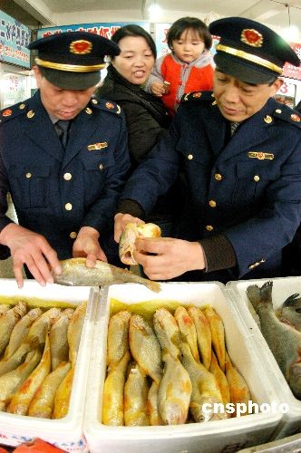 11月24日,連云港市連云工商分局針對海鮮市場出現有毒染色黃魚的現象,組織執(zhí)法人員進行了突擊檢查,檢查中發(fā)現一些不法商販在出售“美容”黃魚。中新社發(fā) 王春 攝