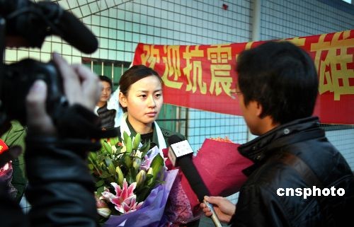 11月26日晨,武警某部貴陽籍女警花徐一蝶和楊帆退伍還鄉(xiāng),乘火車從成都回到貴陽。親朋好友、同學(xué)和慕名而來的人群捧著鮮花在月臺(tái)迎接這兩位在汶川大地震中做出突出貢獻(xiàn),立功受獎(jiǎng),并受到溫家寶總理接見的女警花。今年5月14日,徐一蝶和楊帆在救災(zāi)過程中表現(xiàn)突出,被分別授予二等功和三等功1次。中新社發(fā) 彭年 攝