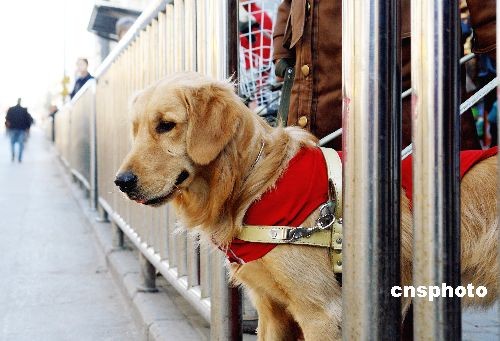 2008年11月25日,河南鄭州市首條經(jīng)過專業(yè)訓(xùn)練的導(dǎo)盲犬“福娃”在街頭做準(zhǔn)備練習(xí)。預(yù)計(jì)“福娃”年底即可上崗,也需要市民們的寬容協(xié)助。中新社發(fā) 馬健 攝