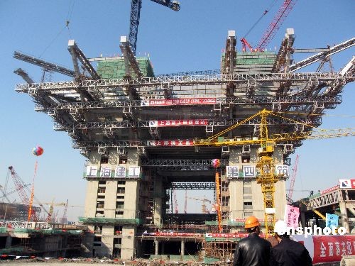 11月28日,備受外界關(guān)注的中國2010年上海世博會中國館實現(xiàn)混凝土結(jié)構(gòu)封頂,初露雄姿。以“東方之冠”為構(gòu)思主題的這一巨型展館,自2007年12月18日開工建設(shè),總預(yù)算達15億人民幣。據(jù)了解,上海世博會中國館有望于2009年10月前完成整體建設(shè)。 中新社發(fā) 許曉青 攝